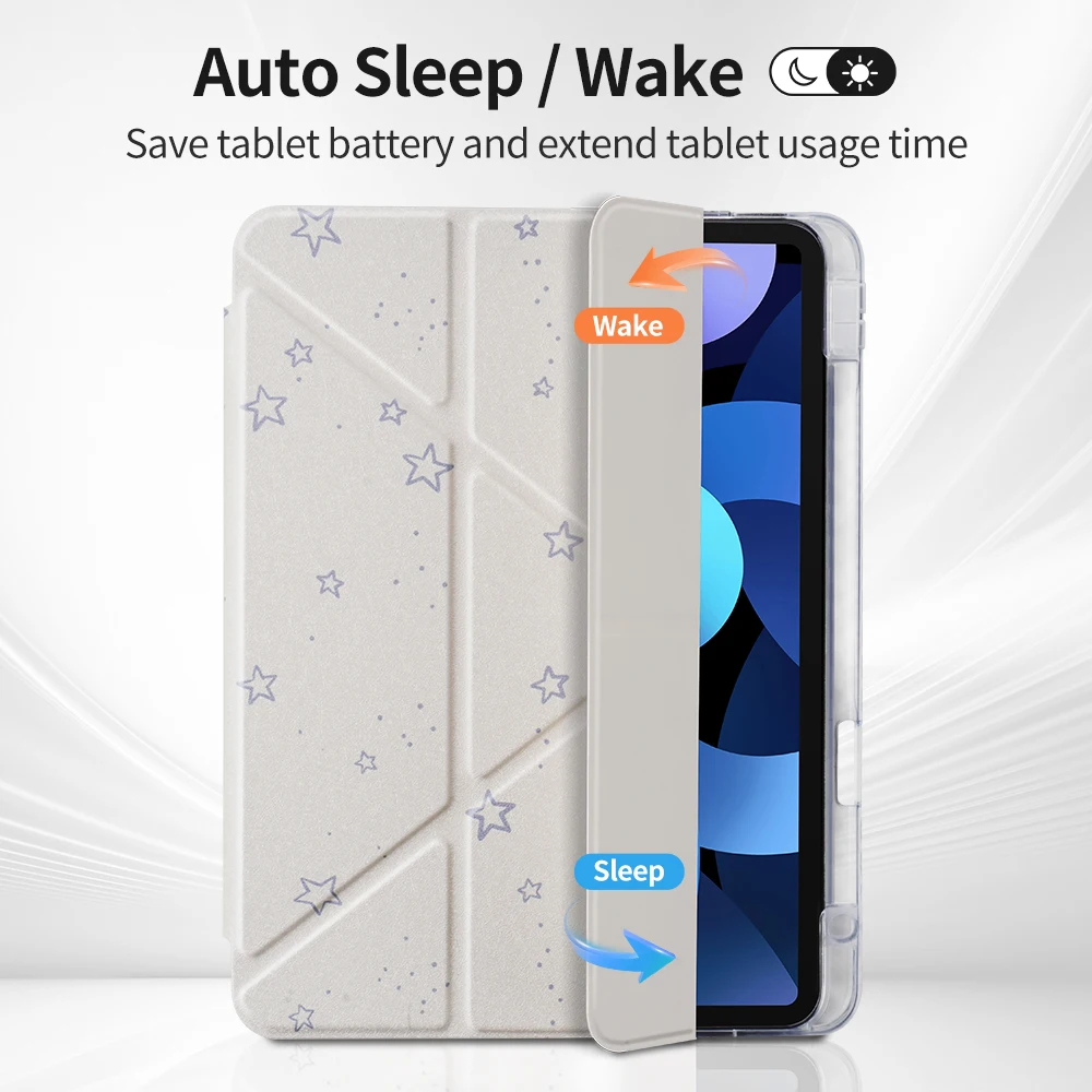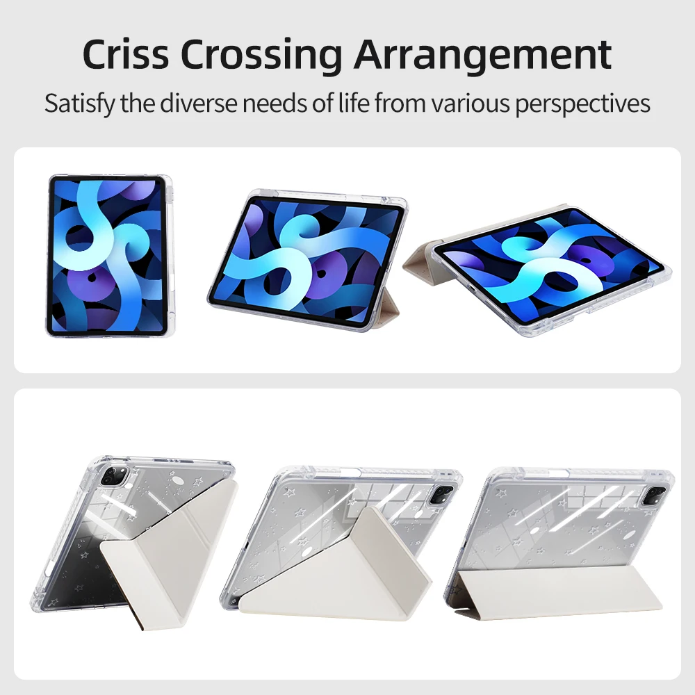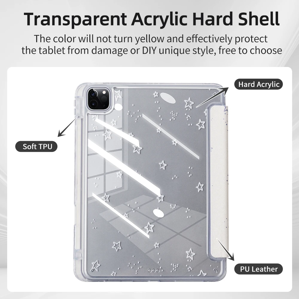 Erhältlich in verschiedenen Varianten. Passend für verschiedene iPad-Generationen und Displaygrößen — modellspezifische Passform wichtig. Jede Variante behält das transparente Grunddesign mit Sternenmuster; wähle passend zu deinem iPad-Modell.