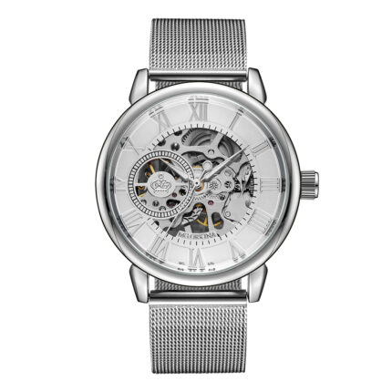 Skeleton Dial Mechanical Hand-wind Clock Stainless Steel Mesh Band Men’s Wrist Watches