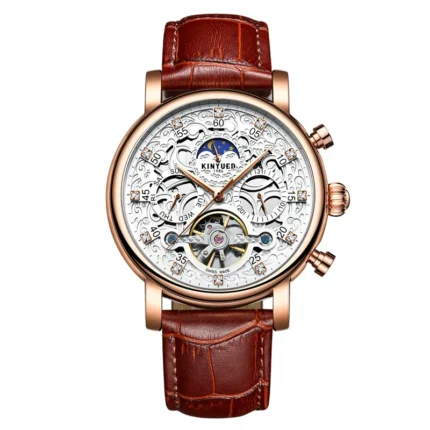 Herrenuhr Automatik Skelett Mondphase Datum Wochentag Roségold 42mm Lederarmband
