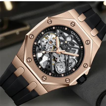 KINYUED Automatikuhr Herren Skelett 42mm Roségold Silikonband 3 ATM wasserabweisend