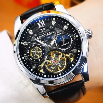 AOKULASIC Herren Automatikuhr 41mm Skelett Mondphase Edelstahl Lederarmband 3 BAR Spritzwasserschutz