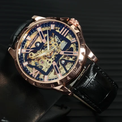 Herrenuhr Automatik Skelett Mondphase Datum Wochentag Roségold 42mm Lederarmband