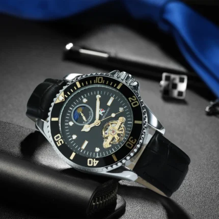 DIFFUL Herren Automatikuhr Skelett Mondphase Dual Time Edelstahl Lederarmband