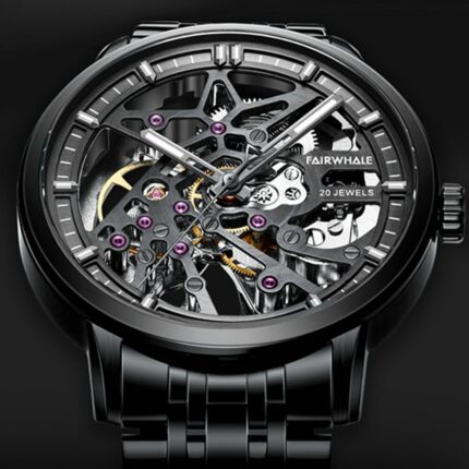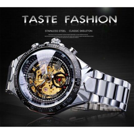 Luxuriöse Edelstahl-Uhr mit Skelett-Zifferblatt, goldenem Uhrwerk und automatischem Aufzug