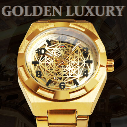 Herren Gold Skelett Automatikuhr Edelstahlarmband | Luxusmarke | Leuchtend