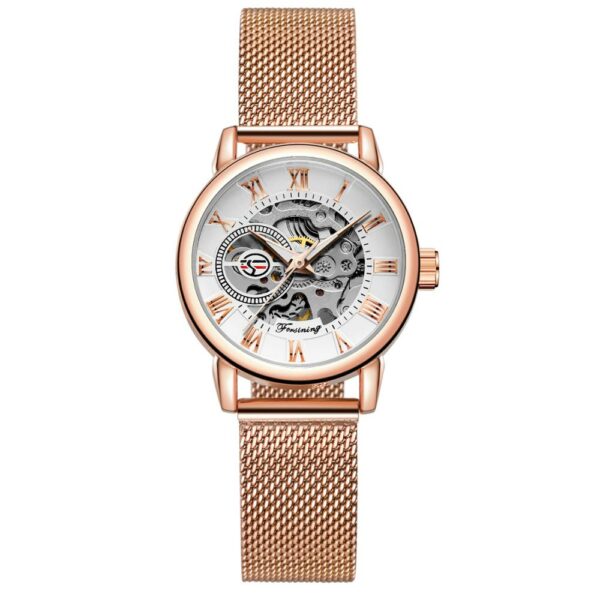 Ladies Fashion Rose Gold Mesh Belt Skeleton Women Mechanical Watches