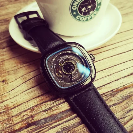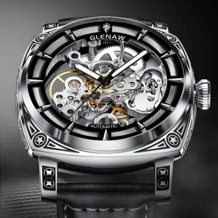 Armbanduhr für Herren Automatik Skelettuhr Edelstahl Leuchtzeiger Mineralglas 42mm