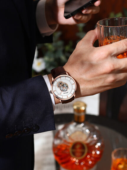 Herrenuhr Automatische Armbanduhr Lederband Sport Uhr Dünne Skelett